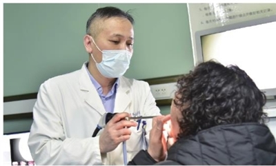 三医耳鼻咽喉头颈外科主任杨嵘为患者检查咽喉。