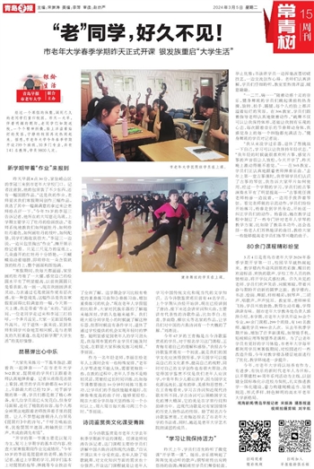 3月4日是青岛市老年大学2024年春季学期开学第一日,校园早早就热闹起来。教学楼内外迎风招展的彩旗、醒目的欢迎标语、欢快的歌声、学校工作人员的热情相迎,将开学仪式感拉满。许久未见的老师、学员们欢声笑语、问候寒暄,带着兴奋与期盼开启新的圆梦之旅。教学楼内,书法、绘画、舞蹈,样样精彩;钢琴声、二胡声、唱歌声,声声悦耳。教室里,老师神采飞扬,学员兴致勃勃,教得生动有趣,学得津津有味。据市老年大学教务处负责人郭萍介绍,本学期,市老年大学共开设30余个专业,80余门课程,299个班级,有141名教师,编班学员9800余人次。从去年秋季学期开始,增加了许多新课程,如智能手机、短视频应用等智慧养老课程。为了让老年学员有更好的学习体验,市老年大学每年都利用学员寒暑假期间,对校园进行一些改造升级,今年对教学楼各楼层地面进行了优化,教学环境进一步提升。