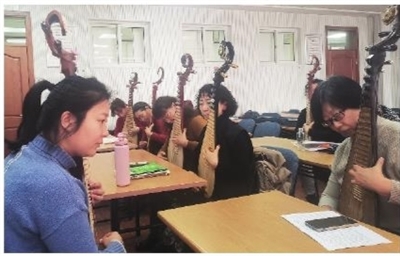 “开学的第一节课主要是以复习为主,复习上学期学的基本功内容,检查大家寒假期间作业完成情况。”今年33岁的李丽是琵琶班的老师,她告诉记者,通过上学期的学习,同学们基本上对琵琶的抱琴、弹挑等专业技法有了全面了解。这学期会学习比较有难度的重奏练习曲和合奏练习曲,增加重奏练习的机会。“现在老年人学琵琶的比较多,大家对民族乐器的了解越来越深刻,学的人也越来越多。我们班大部分同学是小的时候就了解这种乐器,但那时候没有条件学习,退休了通过学校提供的机会实现年轻时的梦想。能明显感觉到老年人的学习劲头足,我每周布置的作业学员们能及时完成,在群里大家积极发练习视频。”李丽说。