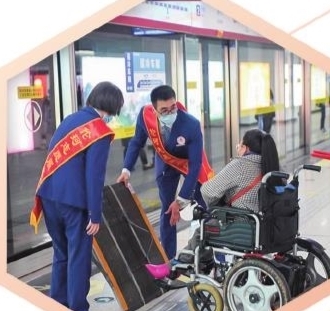 1 地铁志愿服务队成员帮助坐轮椅乘客乘车。