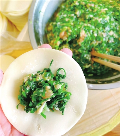 除了凉拌荠菜,胶东半岛人家大约都喜欢荠菜饺子,家中主妇时不时摆起案板、抄起擀面杖包上一顿。“包荠菜饺子,不放点青岛本地的东西不好吃。”李艾说,荠菜特别“喜油水”,有两种食材和它搭配最能凸显荠菜的鲜。“放五花肉和蛤蜊肉。”像李艾一样,青岛人包荠菜饺子大都少不了蛤蜊肉、五花肉。纯瘦肉太柴,没有油水,包出来的饺子太干。放蛤蜊肉是为了提鲜,加入蛤蜊肉的荠菜饺子,一咬全是汤。当然,这也对擀皮这一环节提高了要求,因为有汤,所以饺子皮必须要擀得有韧性。此外,荠菜饺子不能长放,包完赶紧下锅煮。