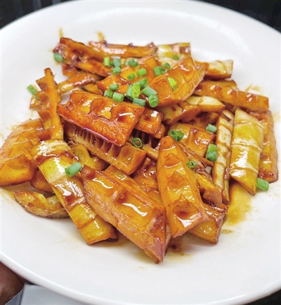 油焖笋是春笋菜中的常青树,也是所有竹笋菜中,最过瘾的一道菜。青岛黄海饭店的刘大厨分享了烹制心得:“春笋切小条,水开后加一小勺盐,放入春笋焯水10分钟去除苦涩味。起锅烧油时,油可以稍微多倒一些,油热放蒜末和小米辣炒香。放入春笋翻炒均匀,加一勺生抽、一勺蚝油、一勺老抽、适量鸡精和白糖调味,加入刚好没过食材的清水,盖上锅盖中小火焖10分钟左右,最后大火收汁就能出锅享用。”这样做出的油焖笋爽脆鲜嫩,百吃不腻还下饭。