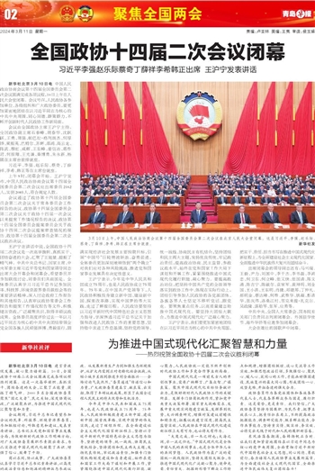 新华社北京3月10日电 建言资政促发展,凝心聚力谱新篇。10日,全国政协十四届二次会议圆满完成各项议程胜利闭幕。这是一次高举旗帜、真抓实干、团结奋进的大会,汇聚了正能量、提振了精气神。2000多名全国政协委员聚焦“国之大者”、民之关切,深度协商议政,广泛凝聚共识,为推进中国式现代化汇聚智慧和力量。