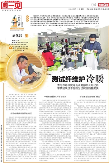 纤维既是重要的工业原料,又是关键的战略物资、民生商品,其质量水平关系到经济的发展,又连着民生的冷暖。而“纤检人”是一群为了保障纤维制品的使用安全而默默奉献、认真履职的人,他们的工作不被广大群众所知晓,但对保障人们的消费和使用纤维制品的安全却尤为重要。一代代纤检人发挥专业技术优势,助力纤维产业升级,维护市场稳定,青岛市纤维纺织品检验研究院综合业务部部长刘优昌就是其中一员。