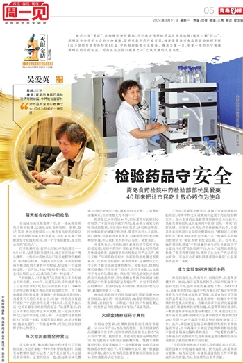 在岛城市南区隆德路7号,有一栋夜晚经常亮灯的实验楼,这就是青岛食药检院。取样、登记、鉴别、发出检验报告……作为青岛食药检院总监、中药检验部部长的吴爱英,从业40年来一直默默坚守底线和原则,用一个个客观数据,成为民众用药“把关人”。