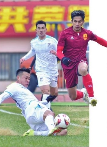 本场比赛青岛红狮队采用了442阵型,朱泉担纲首发门将,张帅、黄旭恒出任中后卫,陈龙和张亮兵分两翼,队长孙旭和聂傲双、陈吉、陈浩玮坐镇中场,陈佳奇和U21小将皮梓杨组成一高一快的锋线搭档,本周刚到队的外援萨诺戈和佩德罗坐在替补席。开场之后,大连英博占据场上主动,两名外援之间的连线给青岛红狮队的后防线造成不小的压力。青岛红狮队后防线顽强防守,在禁区前沿化解了对方的多次有威胁的进攻。顶住了大连英博队的三板斧之后,青岛红狮也逐渐利用边路突破寻找机会,不断发起进攻。第33分钟,青岛红狮队迎来上半场最好的一次破门机会,可惜皮梓杨门前抢点没能触碰到皮球,错失进球。上半场比赛结束,两队战平。