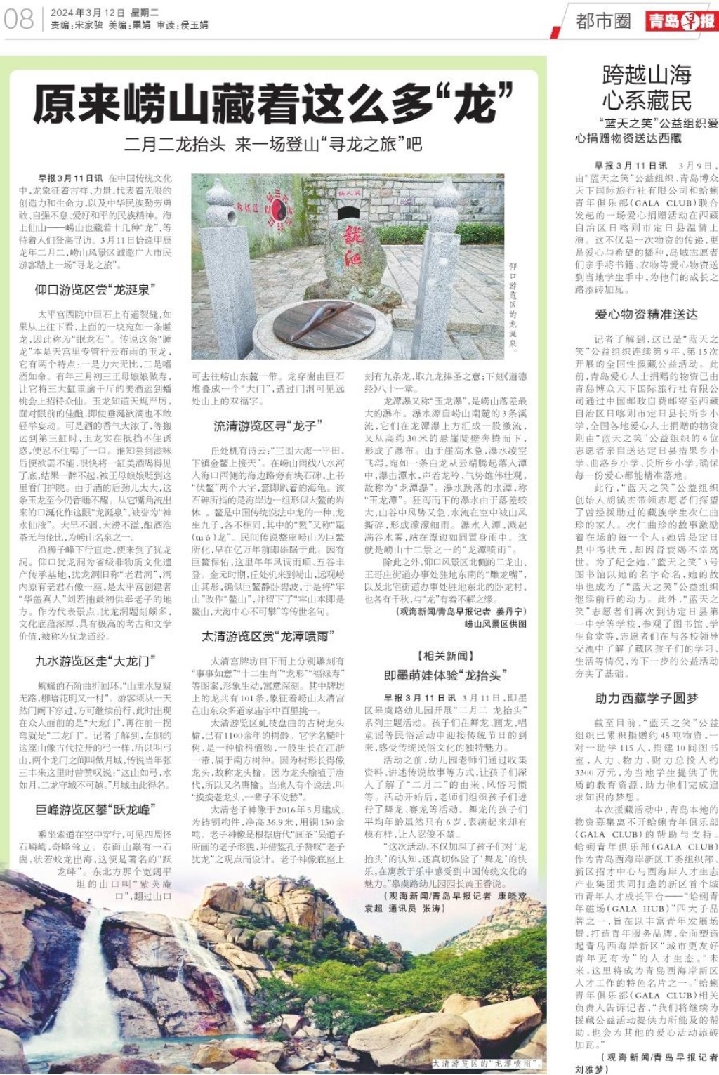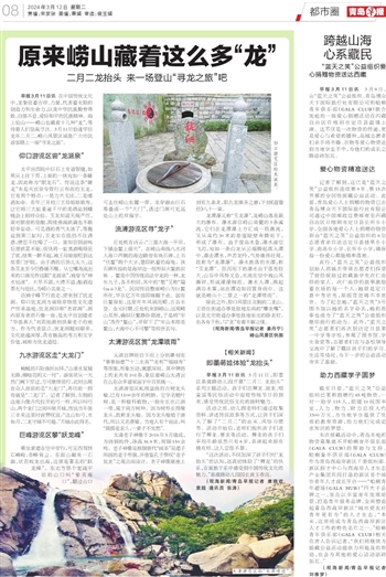 早报3月11日讯 在中国传统文化中,龙象征着吉祥、力量,代表着无限的创造力和生命力,以及中华民族勤劳勇敢、自强不息、爱好和平的民族精神。海上仙山——崂山也藏着十几种“龙”,等待着人们登高寻访。3月11日恰逢甲辰龙年二月二,崂山风景区诚邀广大市民游客踏上一场“寻龙之旅”。