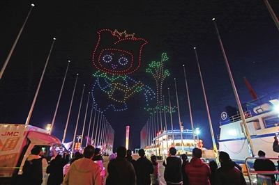 组图:全国首个义务植树无人机公益星空秀在奥帆中心上演。 观海新闻/青岛早报首席记者 孙启孟 摄