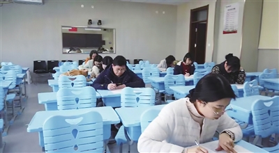 上午9点,穿着校服的学生们正在宽敞明亮的教室里参加考试,讲台上坐着监考老师,学生们低头认真答题。而在另一间教室里,学校的老师与学生一样,也在埋头认真答卷。“今天上午第一门是语文科目的考试,参加考试的都是来自高二高三年级的语文老师,这是学校多年来一直坚持的一种教学模式。”青岛十七中办公室副主任陈喆告诉记者。