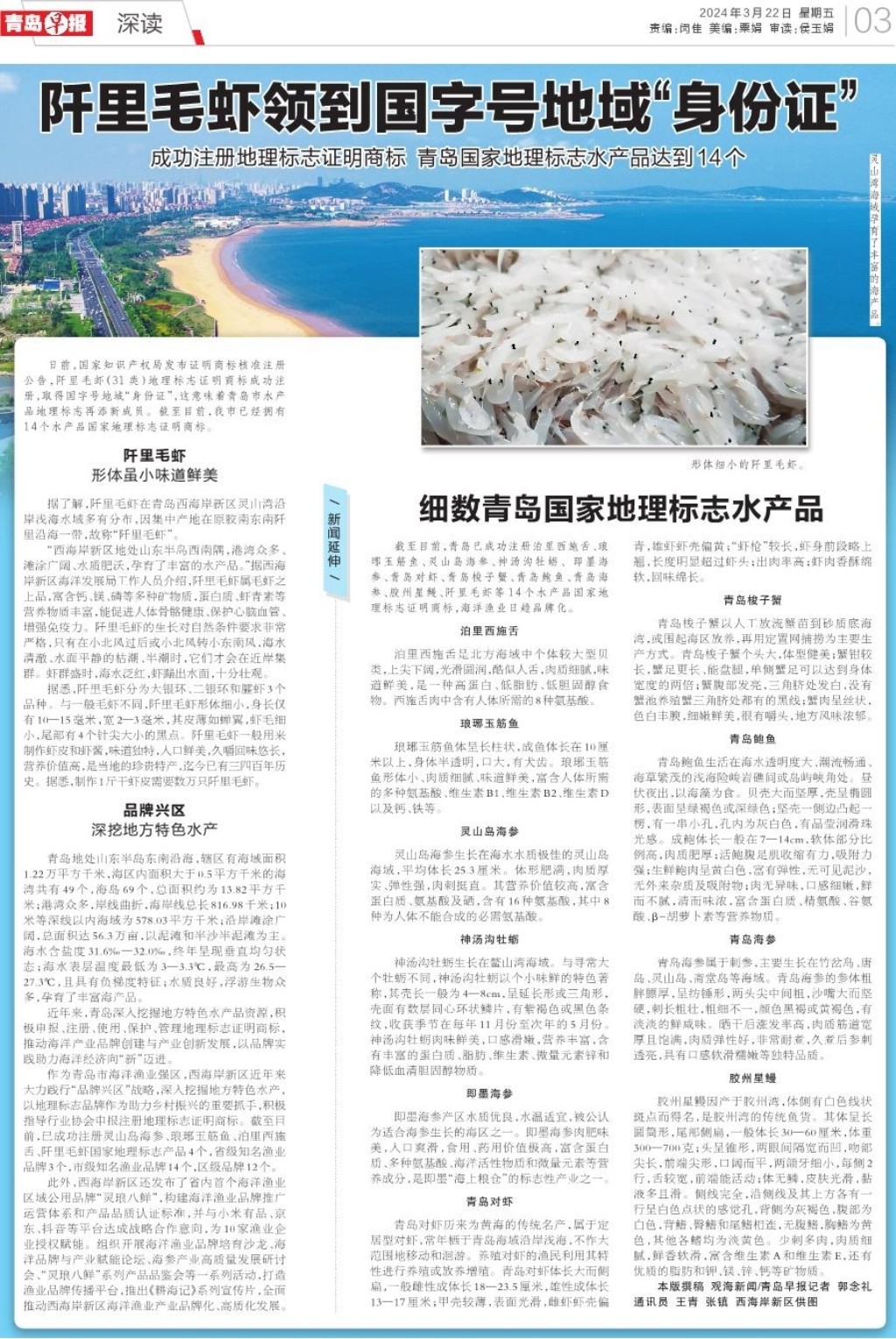作为青岛市海洋渔业强区,西海岸新区近年来大力践行“品牌兴区”战略,深入挖掘地方特色水产,以地理标志品牌作为助力乡村振兴的重要抓手,积极指导行业协会申报注册地理标志证明商标。截至目前,已成功注册灵山岛海参、琅琊玉筋鱼、泊里西施舌、阡里毛虾国家地理标志产品4个,省级知名渔业品牌3个,市级知名渔业品牌14个,区级品牌12个。
