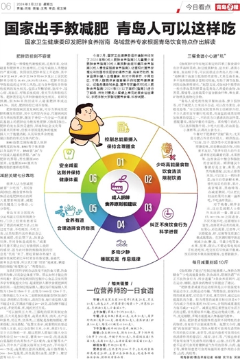 今年2月,国家卫生健康委组织编制并印发了2024年版《成人肥胖食养指南》《儿童青少年肥胖食养指南》《成人高尿酸血症与痛风食养指南》《成人慢性肾脏病食养指南》,依据现代营养学理论与我国传统医学的调养方案,将食药物质、新食品原料融入合理膳食,针对不同季节、不同地区、不同人群提供食谱套餐示例和营养健康建议。记者邀请岛城食品、营养专家重点对《成人肥胖食养指南(2024版)》(以下简称《指南》)进行了解读,并针对青岛人餐桌上常见的美食给出建议,手把手教大家制定营养食谱,科学减肥。