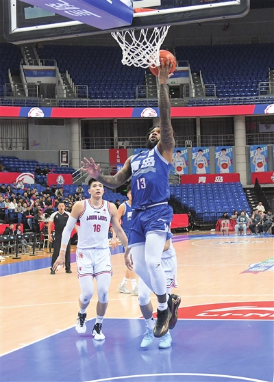 ▶青岛队外援(蓝衣)在比赛中。 观海新闻/青报全媒体记者 王雷 摄