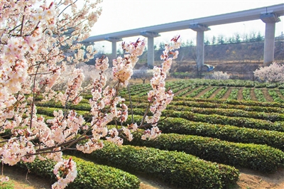 在庙石村的茶园放眼望去,绿色的茶园与粉红的樱桃花交相辉映,茶绿樱红。山间的绿色茶园、数公里的黄色环山木栈道镶嵌其中,一抹红粉相间的樱桃花开在步道两侧,红黄绿相间的美勾勒出一幅美丽的田园风景图。
