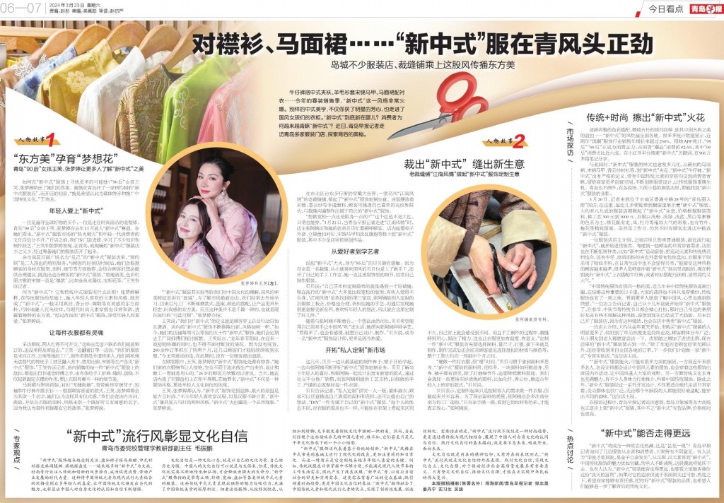 “新中式”将成为一种常态化热潮,还是“昙花一现”?青岛早报记者询问了几位服装从业者和消费者,大家持有不同意见。有人认为“华流才是顶流,是金子总会发光”,从汉服、汉元素再到“新中式”,中国传统服饰的魅力犹如宝藏,传承人不断涌现,这股潮流将延续下去。也有人认为,“新中式”服装能否走得更远,也要看大家能否接住这份“泼天的富贵”,如果对它的追求仅流于表面则太过可惜,热度之下,希望商家能够有责任感,把控好“新中式”服装的品质,也希望人们能够进一步了解背后的传统文化。