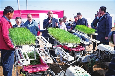 3月26日,平度市仁兆镇东寨子村的一处蔬菜种植基地内,手扶式喷杆喷雾机、开沟起垄机、全自动大葱钵苗移栽机、多功能培土机等机械正在田间作业,这里正在开展“全国农机地头展——大葱生产全程机械化演示观摩活动”,来自全国30余家农机生产企业的60多台装备参与现场演示,涵盖了大葱耕、种、管、收等全程机械化生产,近400人参加现场观摩活动。国际田间试验机械化协会主席、青岛农业大学学术委员会主任尚书旗教授在现场指导了大葱机械化种植作业。“使用我们的蜂窝纸带式大葱移栽机,一天可以种5亩,和以前人工移栽相比,工作效率能提高5倍。”青岛锐星机械有限公司经理刘德波介绍。