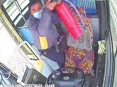 真情巴士东17路驾驶员韩玉满紧急从驾驶室拿取灭火器。真情巴士供图