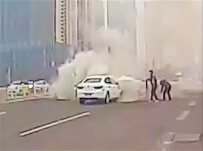 3月27日下午,真情巴士东1路驾驶员王立彦正在执行发往黄岛轮渡的营运任务。当天16时46分路过黄河路立交桥附近路段时,他注意到前方有一辆白色轿车停在马路中间,车头冒出滚滚白色浓烟并已经出现明火,私家车主正焦急地在车旁拨打119报警电话。