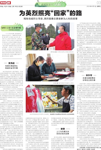 一个个寻亲故事,展现拥军之城的红色担当;一幅幅英烈画像,彰显拥军之城的血脉传承。 2021年,青岛市退役军人事务局启动了“为烈士寻亲·让忠魂归根”专项行动,与青岛早报联合发起成立“绘忆英烈”公益团队,首次举办“绘忆英烈”画像展并推出《绘忆英烈》画册。3年来,已为110名英烈画像,已找到199名英烈亲属,烈士寻亲志愿者、英烈画像志愿者团队与青岛市退役军人事务局、青岛市革命烈士纪念馆携手谱写了新时代的动人篇章。