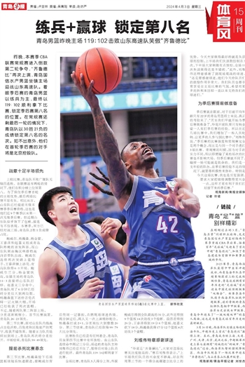 昨晚,本赛季CBA联赛常规赛进入倒数第二轮争夺,“齐鲁德比”再次上演,青岛国信水产男篮坐镇主场迎战山东高速队。着眼季后赛的青岛男篮以练兵为主,最终以119∶102顺利拿下比赛,锁定季后赛第八名的位置。在常规赛还剩最后一轮的情况下,青岛队以30胜21负的成绩锁定第八名的名次。如不出意外,他们在首轮季后赛的对手将是北京控股队。