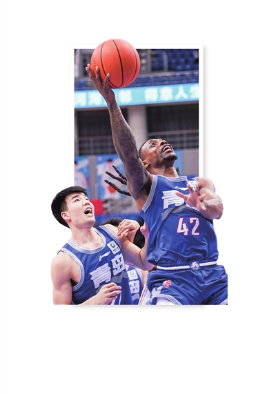 青岛国信水产男篮球员穆迪(右)在比赛中上篮。 新华社发