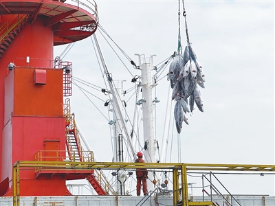“海洋之星”轮是中国首艘金枪鱼超低温冷藏加工运输船,加工季单日加工量可达66吨。此批金枪鱼主要为黄鳍金枪鱼、大目金枪鱼,每条重约50—100斤,从南非开普敦运往韩国釜山,中途将在中国卸载1976吨。