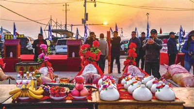 渔民们把披红戴花的大肥猪摆好,挑选大个鲈鱼、海参、赤贝等海产品摆上供桌,等待祭海仪式的开始。