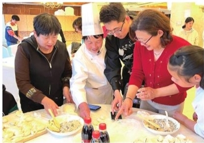 厨师教市民包鲅鱼饺子。沙子口街道办事处供图