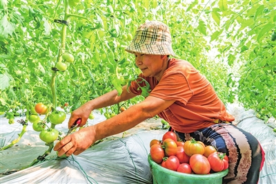 村民谭光明是上合禧柿共富产业园里的种植户之一,“我们这里主要种植‘甜如蜜1号’和‘粉冠王’两个品种的西红柿,从3月中旬开始一直到6月底陆续成熟采摘上市。我们按照边建设、边种植的生产模式,种植过程中,对西红柿生长环境进行精准控制,每座大棚预计收获6万斤左右。我一共承包了两座大棚,每年收入大概在15万元左右。”谭光明说。