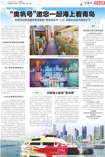近年来,为创新旅游产品供给,充分满足游客多样化精神文化需求,青岛旅游集团推进实施创新文旅活动落地,为青岛海洋旅游发展赋能。今年3月,青岛旅游集团推出栈桥经典环游航线新产品,特色是能够一站式观赏青岛经典风光——从海底世界码头出发,环绕青岛湾,沿途可观赏到以形状奇特闻名的“古琴”小青岛、栈桥等青岛标志性景点。乘船出海,从另一角度欣赏青岛“红瓦绿树、碧海蓝天”的美景与中国式现代化城市的结合,深入感受青岛的历史痕迹,为旅客提供一次深度人文之旅。