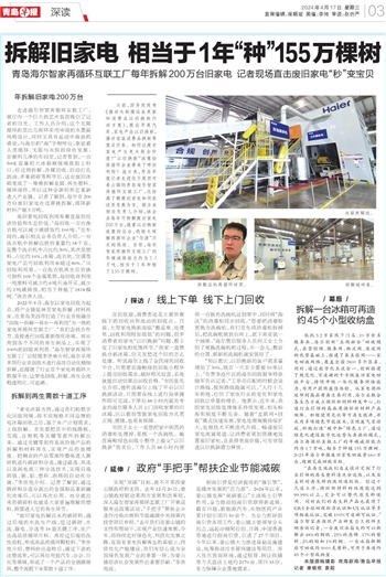 废旧家电回收利用有着直接的经济价值和生态价值。“每回收一万台洗衣机可以减少碳排放约100吨。”在车间内,海尔相关业务负责人介绍,一台洗衣机中拆解出铁的重量约18千克,在整个洗衣机中占比约30%,其次是塑料,占比约10%,冰箱、洗衣机、空调等家电产品可回收利用率超过80%。“从回收利用看,一台洗衣机再生后的铁可制作109个金属笔筒,每回收再利用一吨塑料可减少约6吨石油开采,减少约2吨碳排放,相当于种植了1818棵树。”该负责人说。