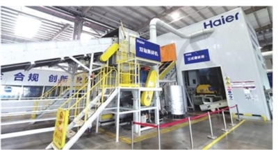 走进海尔智家再循环互联工厂,展厅内一个巨大的艺术装置吸引了记者的目光。工作人员介绍,这个无限循环的莫比乌斯环采用中国的水墨画风格设计,同时又具有运动中海浪的感觉,与海尔的“海”字相呼应,象征着人类循环、无限与永恒的绿色发展。在窗明几净的车间里,记者看到,一台500L容量的大冰箱被缓缓推到上料口,经过预拆解、冷媒回收、自动打孔沥油、多重破碎等程序后,这台废旧冰箱变成了一堆堆拆解金属、再生塑料、循环部件,并以这种全新的形态重新进入产业链。记者了解到,每年有200万台废旧家电在这里被拆解,循环新材料产能3万吨。