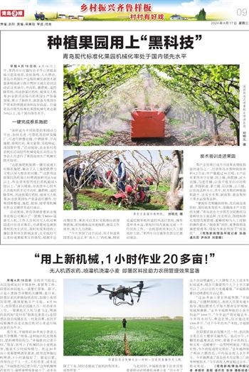 早报4月16日讯 4月16日上午,莱西市日庄镇恒岳丰开心家庭农场示范基地里,农机轰鸣、人头攒动,青岛市果园生产全程机械化新技术新装备现场演示推介暨防灾减灾培训活动在这里举行,开沟机、撒肥机、遥控除草机、风送弥雾打药机、植保无人机等20余款灵活轻巧的果园生产装备登场,展示了新技术、新装备为果园生产带来的便捷高效和良好收益。目前青岛市现代标准化果园机械化率达到70%以上,处于国内领先水平。