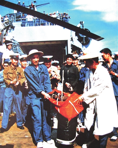 苦等多时的外国飞机没有讨到便宜,只好打了一桶被数据舱染色的海水飞回他们的军舰。当舰载直升机顺利安全地降落在甲板上后,机组飞行员抬下数据舱,全体参试人员欢呼雀跃,舰船汽笛长鸣,响彻云霄。