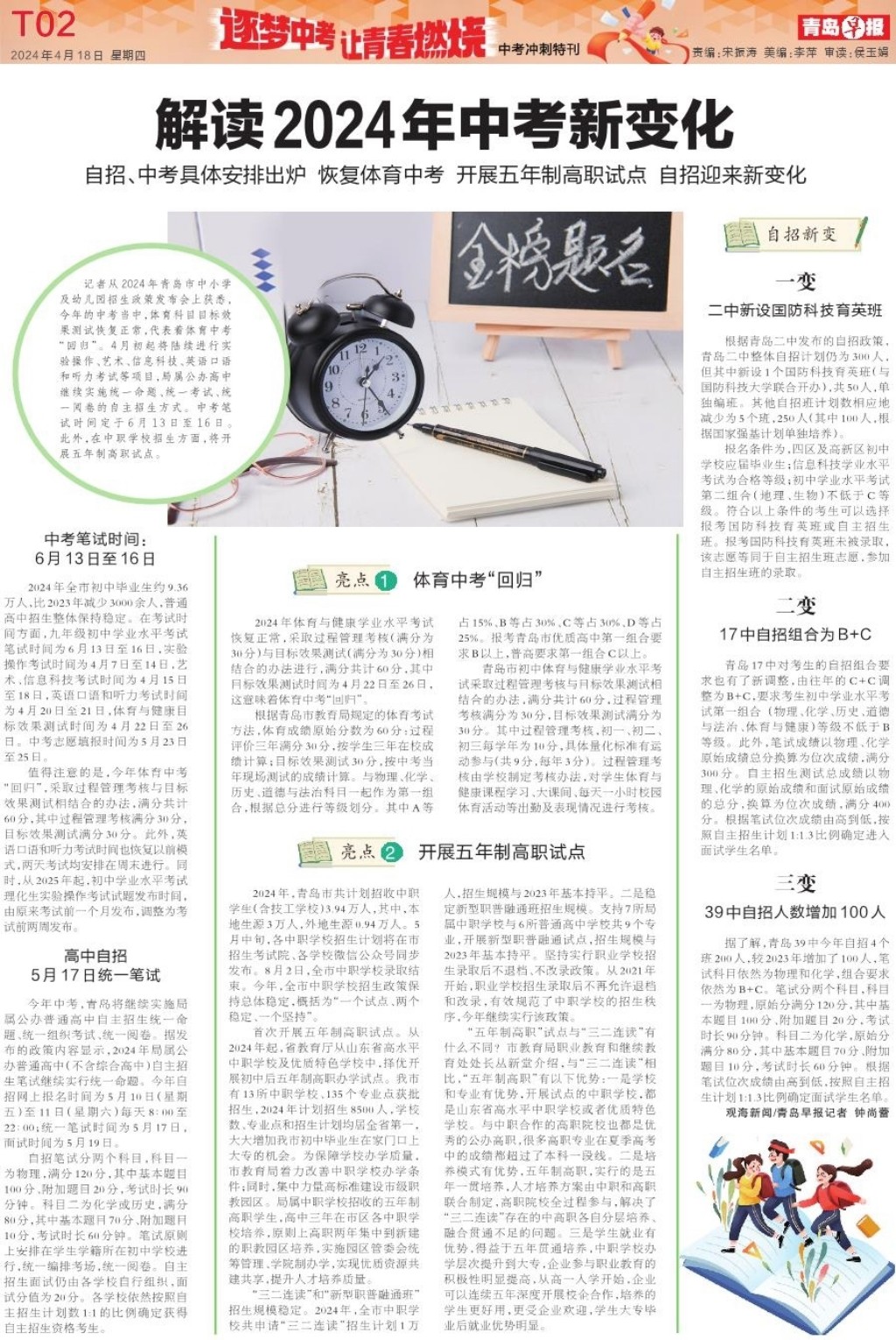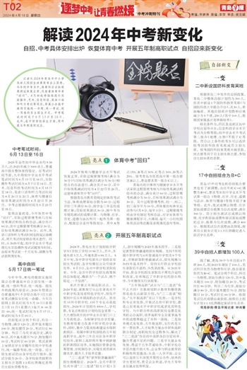 记者从2024年青岛市中小学及幼儿园招生政策发布会上获悉,今年的中考当中,体育科目目标效果测试恢复正常,代表着体育中考“回归”。4月初起将陆续进行实验操作、艺术、信息科技、英语口语和听力考试等项目,局属公办高中继续实施统一命题、统一考试、统一阅卷的自主招生方式。中考笔试时间定于6月13日至16日。此外,在中职学校招生方面,将开展五年制高职试点。