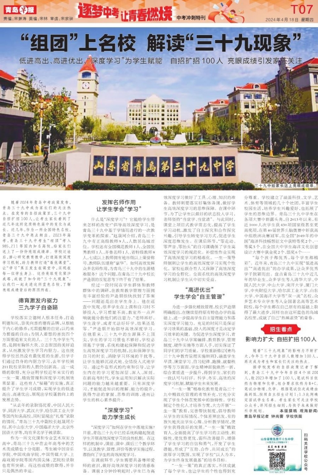 什么是“深度学习”?它能给学生带来怎样的改变?“倡导高效深度学习,是青岛三十九中基于学情而进行的一次教学变革的探索。”赵晟珂介绍,青岛三十九中有正高级教师9人,人数居岛城首位。学校还有全国模范教师1人、全国优秀教师1人、齐鲁名师1人、省特级教师8人,七成以上教师拥有地市级以上荣誉称号,教师队伍堪称“豪华”。如何高效发挥众多名师作用,为青岛三十九中的生源精准服务?这个问题,在青岛三十九中校长尹逊朋的反复思考下终于有了结果。