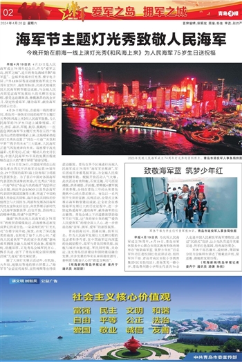 4月20日晚开始,在前海一线的楼宇间,青岛用一场恢宏壮阔的海军节主题灯光秀《和风海上来》向人民海军致敬,为人民海军的75岁生日送上诚挚祝福。灯光、音乐、海洋,军舰、航母、舰载机……红蓝色调的海军节主题灯光秀在五四广场及浮山湾的楼体精彩上演,这场精彩绝伦的灯光秀共设置了“同在一片海”“共筑和平梦”“携手向未来”三大篇章,人民海军正意气风发地奔向未来。每座楼宇流光溢彩,光影变幻,汇成一幅动人的史诗长卷,中国人民海军75年来的发展历程浓缩在这巨大的“楼宇屏幕”徐徐呈现。