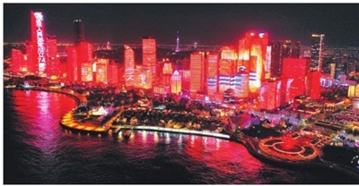 随着“热烈庆祝人民海军成立75周年”的祝贺语缓缓流过,沿海楼体逐渐变成梦幻的星空色,一朵朵绚烂的“灯光礼花”在楼宇间升起、绽放,点亮了深沉温柔的海面,也照亮了每个人的心间。“爱我人民爱我军”“我的家乡我的舰”意味着双拥理念融入岛城军民血脉、根植传统、底蕴深厚,正是青岛全城军民齐心、携手共进,创下了青岛实现全国双拥模范城“九连冠”的光荣纪录。