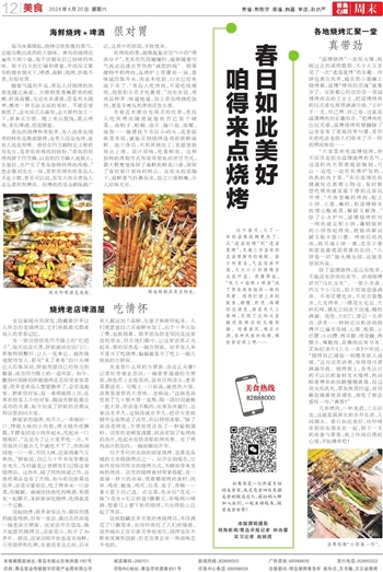 这个春天,火了一年的淄博烧烤更热了。从“进淄赶烤”到“进淄复烤”,灵魂三件套依然是淄博烤肉的绝配。春日的青岛,气温逐渐升高,大大小小的烧烤店也在升温。夜幕降临,“炭火+海鲜+啤酒”成了青岛美食独具一格的风景。刚刚打捞上岸的鱿鱼、螃蟹、虾虎、海螺经过清洗,放在炭火上烘烤,实现了从码头直接到烧烤店的无缝衔接。迎着春风,喝点小酒,各种风格的烧烤,都赶紧安排上吧……