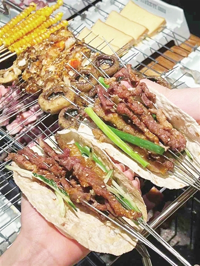 “大家喜欢吃淄博烧烤,绝不仅仅是因为淄博烧烤的名气,这里的肉不需要提前腌制,可以一边吃一边用炭烤炉加热,热热的肉才香。”来自淄博的张婧就住在新都心附近,有时候想吃烤肉就直接下楼到这家店开烤。“外焦里嫩的烤肉,配上小饼、小葱、蘸料,和淄博特有的博山酸咸菜,解腻又解馋。”除了小火炉外,淄博烧烤的另一特色就是配小饼,薄韧暄软的小饼卷起烤肉,既能消解油腻又能丰富口感。烤熟后的肉块,被灵魂小饼一裹,还有小葱和甜面酱或蒜蓉酱的加持,“小饼卷一切”能火爆全国,这就是原因所在。