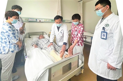 在关节置换手术过程中,麻醉医师的精准麻醉与手术室护理团队的关心照顾,彻底消除了患者的紧张感。手术团队秉持全程微创理念,操作娴熟,不放置引流管及导尿管,减短止血带的使用时间。术后麻醉药物代谢消除后,骨关节外科护理团队会立即指导患者进行踝泵训练及屈伸膝关节锻炼,为患者术后尽快康复奠定坚强的信心。