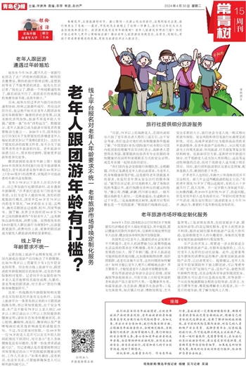 春暖花开,正值旅游好时节。满心期待一次游山玩水的旅行,没想到临近出发,旅行却发生了变故……最近,市民赵先生就碰上了这样一件事儿,旅行社以年纪太大为由拒绝他参团出行。跟团游到底有没有年龄限制?老年人旅游还有哪些门槛?如何才能让老年人更开心顺畅地出游?推动老年人跟团游迈向规范化、品质化、定制化,有助于营造孝亲敬老的氛围,更能为旅游经济注入新活力。