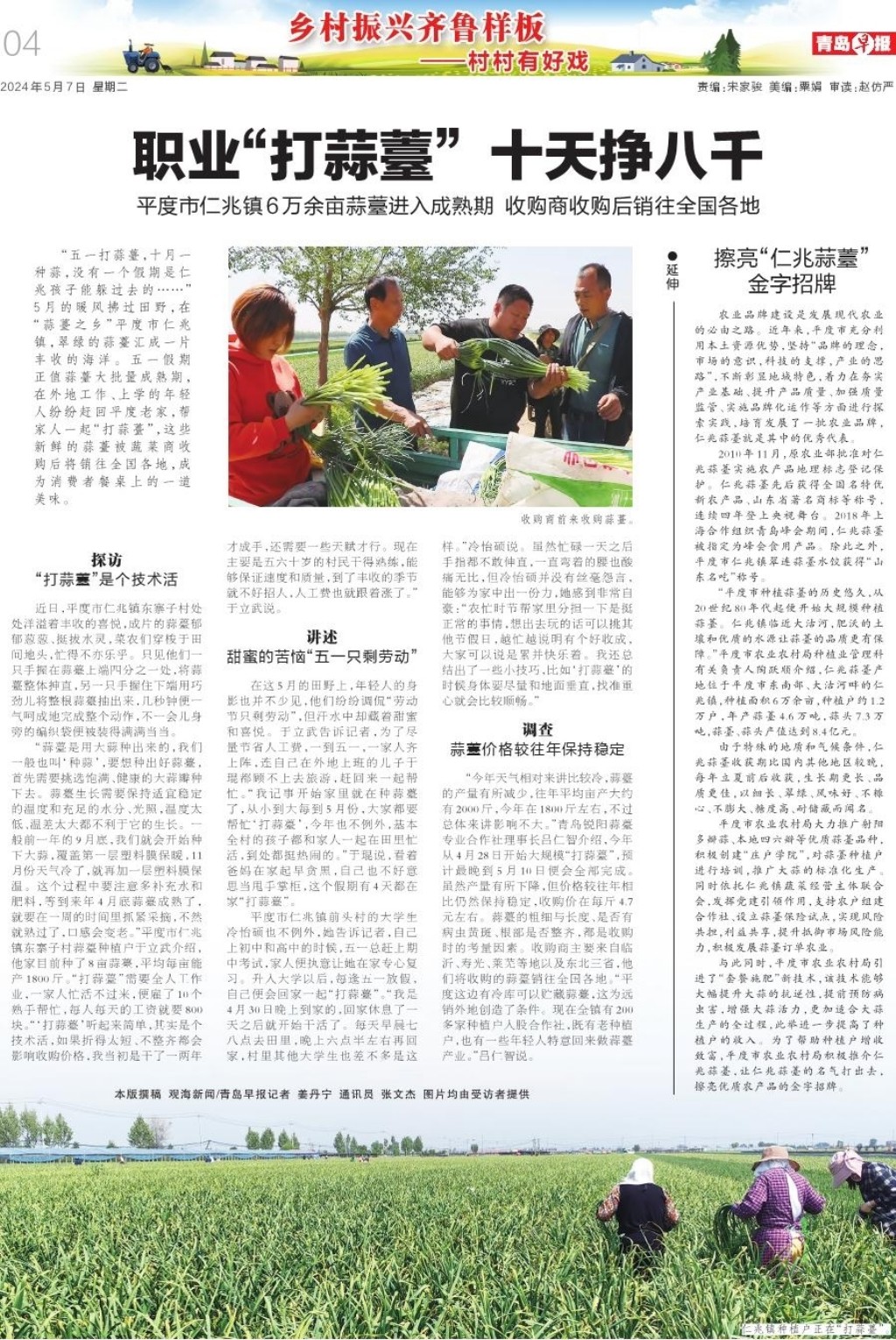 “五一打蒜薹,十月一种蒜,没有一个假期是仁兆孩子能躲过去的……”5月的暖风拂过田野,在“蒜薹之乡”平度市仁兆镇,翠绿的蒜薹汇成一片丰收的海洋。五一假期正值蒜薹大批量成熟期,在外地工作、上学的年轻人纷纷赶回平度老家,帮家人一起“打蒜薹”,这些新鲜的蒜薹被蔬菜商收购后将销往全国各地,成为消费者餐桌上的一道美味。