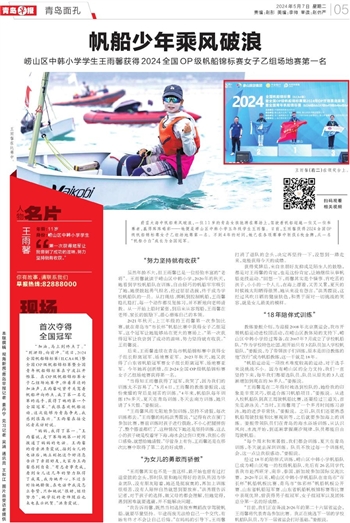 2021年秋天,上三年级的王雨馨第一次参加比赛,就在青岛市“市长杯”帆船比赛中获得女子乙组冠军,这个冠军让她能够站在更大的赛场上。“第一次获得冠军让我尝到了成功的滋味,努力坚持就有收获。”王雨馨说。