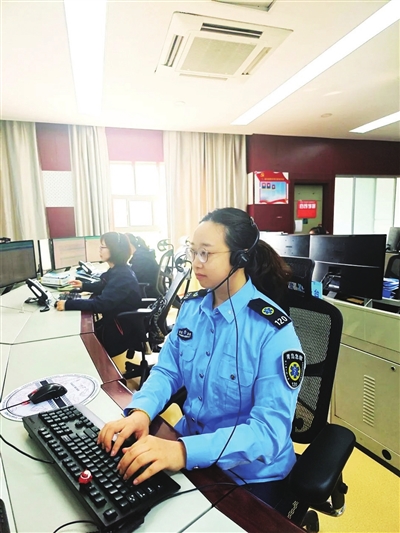 青岛市急救中心120调度指挥大厅内,邵琳琳正在接听电话。