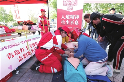 红十字搜救队志愿者在志愿服务公益集市上教市民应急救护知识。