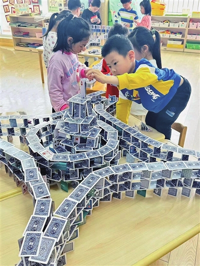 游戏是幼儿最喜欢的活动,青岛市向阳红幼儿园在日常教学活动中组织幼儿开展别具特色的游戏活动,走进小纸牌的搭建奇趣探索之旅。老师们抓住幼儿对扑克牌的好奇心与兴趣点,引导幼儿利用搭建方式发挥小纸牌不一样的游戏功能,鼓励幼儿巧妙地将纸牌进行折叠、延长、对称,利用平铺、垒高、架空、围合等方式搭建,在游戏过程中通过讨论、合作让小纸牌大变身——“站了起来”,幼儿通过一次次摆好“跌倒”的小纸牌,培养坚持不懈精神,锻炼搭建技能和空间感知能力,在积极动脑主动解决问题的过程中,把小纸牌变成了不一样的“天坛”建筑。
