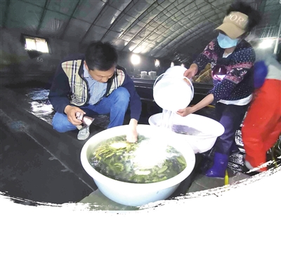 有着近20年海参养殖经验的于宗龙告诉记者,“培育海参苗需要母参,也叫种参,我们最初的海参苗都是自己培育的。每年根据生产需求,挑选种参。”于宗龙介绍,一般是从参池里挑选生长期4—5年、重约一斤的海参作为种参。如果水质、温度等指标适宜,海参就会进行繁殖,排出海参卵,俗称“海参花”。母参平均产卵量在300万粒到500万粒,不过成活率只有十分之一。后期经过多次淘汰,最后只剩下最“强壮”的参苗,数量只有产卵总量的1/30至1/20。为了提高海参产量和品质,他们前几年经常去日照、大连等地抓野参做种参……