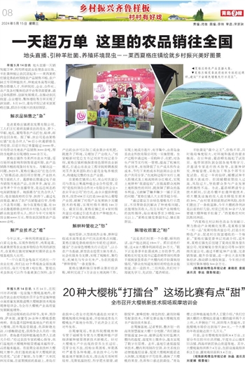 早报5月14日讯 5月14日,在胶州市洋河镇一处设施大樱桃基地内,青岛市农业农村局组织召开全市设施种植业高质量发展推进暨大樱桃新技术现场观摩培训会,为全市大樱桃产业高质量发展赋能增势。