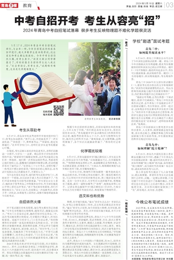 “提前公布考题,让考生熟悉一下面试题目,给孩子们减减压。”青岛三中校长张禹告诉记者,去年青岛三中也提前公布了自招面试题目,考生和家长、老师一起讨论,这体现出学校注重培养学生的学习能力。“有的学生不善交流会自己想答案,有的学生通过交流可以得到更好的答案,对题目是否完全理解,学生在阐述个人观点的时候有没有‘切身体会’,老师很容易看出来。”张禹说。