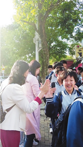 5月17日,青岛各学校送考老师早早地来到学校门口,给考生加油鼓劲。“放平心态,自招就是多了一次实战机会。”“再检查一下,看看准考证。”“别紧张,稳定发挥就行。”在多所学校门口,老师们在学生进考场前耐心叮嘱。